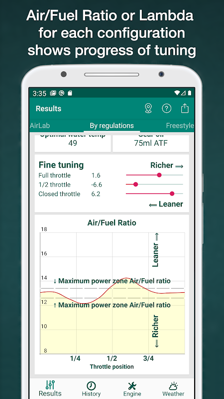 • Resultados: Nesta guia, duas configurações de carburador são mostradas ('Por regulamento' e 'Estilo livre'). Esses dados são calculados de acordo com as condições climáticas e a configuração do motor e do tipo de pista fornecidas nas próximas guias.