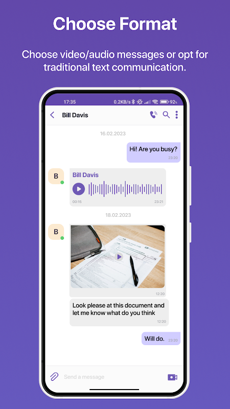 ・ Mensagens de texto, voz e vídeo: Envie mensagens no seu formato preferido para uma comunicação perfeita.