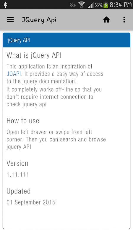 Esta é uma inspiração baseada no site http://jqapi.com/. Esta é uma aplicação off-line, que, uma vez baixado pode ser usado sem conexão com a internet.