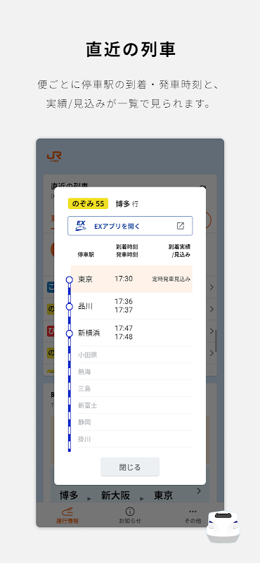 Este é o aplicativo de horários oficial Tokaido / Sanyo Shinkansen da JR Tokai! Você pode visualizar rapidamente os horários dos trens e as estações de parada, facilitando a comparação dos horários de transferência do Shinkansen e dos horários ao escolher um trem.