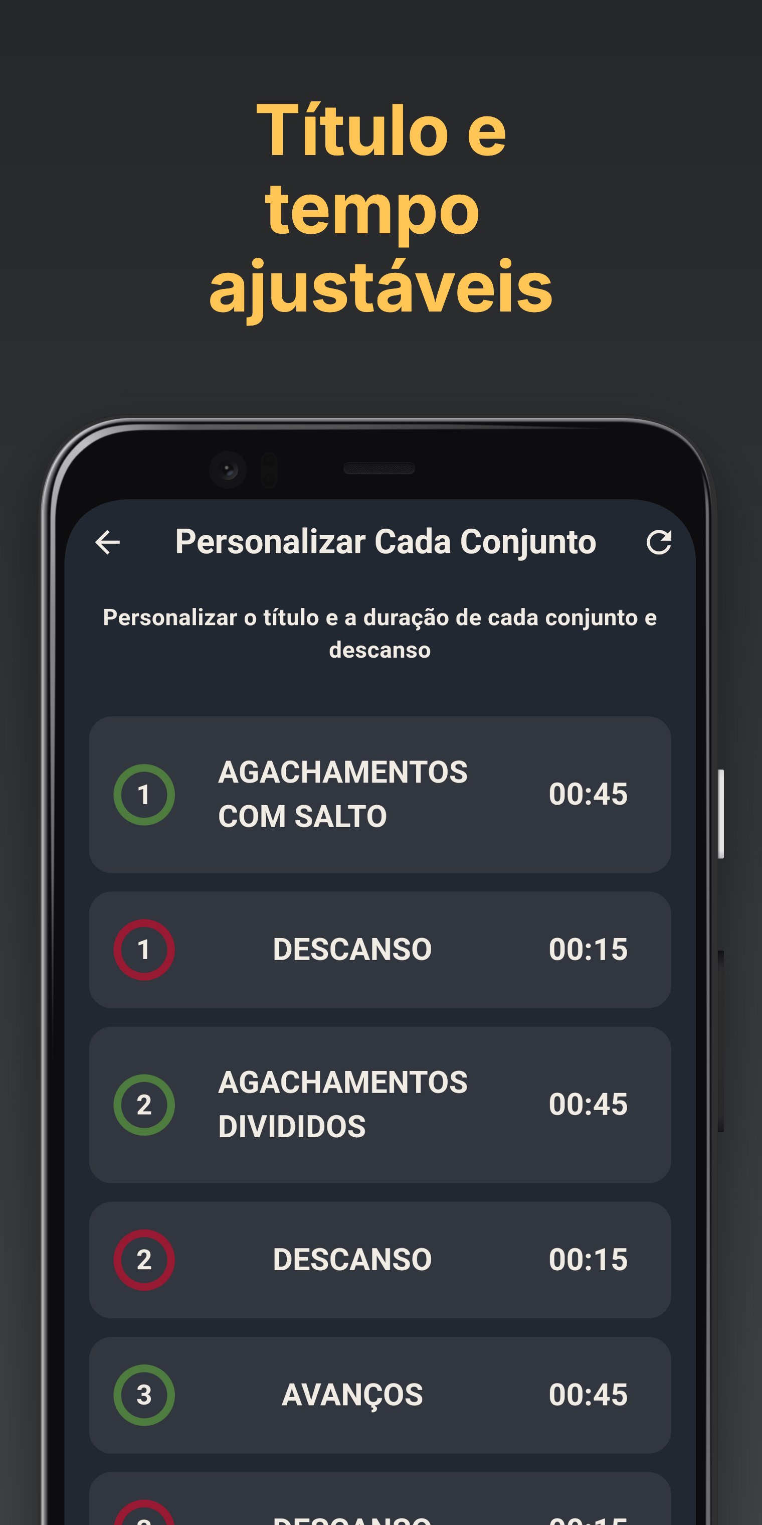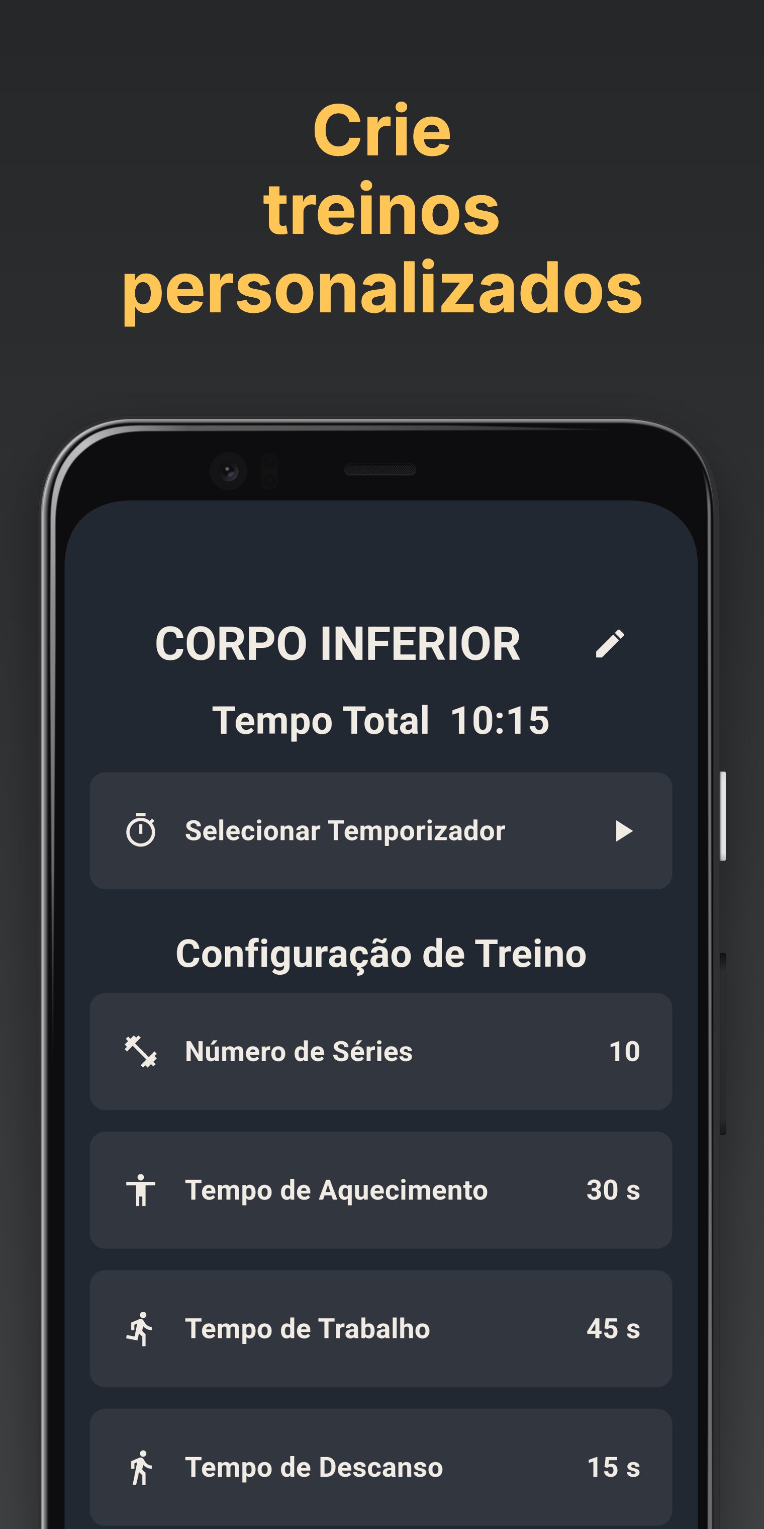 Configuração de Rotina Personalizada: Ajuste livremente o número de séries, tempo de treino e tempo de descanso para se adequar às suas rotinas pessoais.