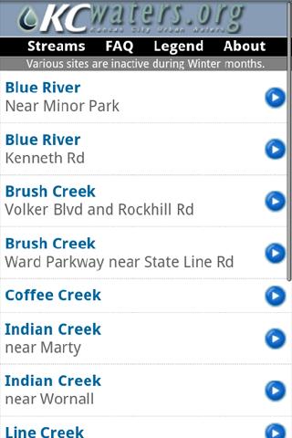 KCWaterBug is an application developed by KCWaters.org, which provides hourly updates of water quality at numerous streams throughout the Kansas City metropolitan area. The application provides a color coded alert based on an estimate of the amount of bacteria that may be found in a particular stream using known relationships between bacteria concentrations and basic water quality parameters.