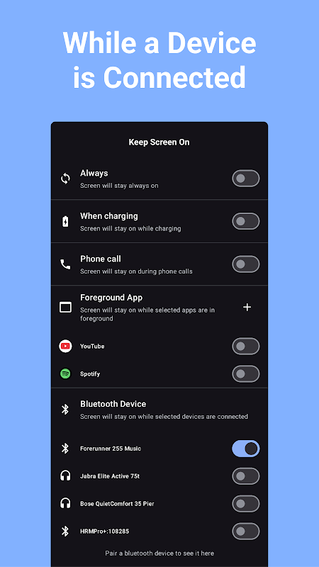 Escolha simplesmente quando e como quer que sua tela permaneça ligada. O design intuitivo permite selecionar condições específicas, como dispositivos Bluetooth conectados, aplicativos ativos em primeiro plano e mais. Com recursos PRO, obtenha ainda mais controle com configurações de tela ligada específicas para aplicativos e chamadas.
