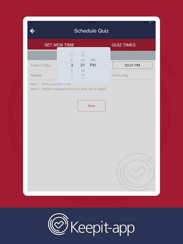 O aplicativo móvel KeepItApp pode ajudá-lo a olhar para cima, rever, ensaiar, e pesquisar o que você aprendeu e, assim, impedi-lo de esquecer informações valiosas. Ela irá ajudá-lo a aprender, recordar e aplicar o seu material. Como? A informação ou conteúdo de seu treinamento, oficina ou seminário será convertido em perguntas. O usuário pode então decidir quando e quantas vezes o aplicativo irá questioná-lo sobre estas questões. Ou por padrão (recomendação do treinador), o modo intensivo, ou simplesmente ensaiando os principais fatos. Uma vez por semana, diariamente ou mensalmente, como você deseja. O aplicativo também pode misturar o conteúdo ou diferentes conjuntos de perguntas tornando-se mais exigente. Além disso, ele vem com vários serviços para atender sua necessidade especial: a partir de "soneca", "lembre-me" ou "leitura-out loud", no carro, no avião, trem, em uma sala de espera ou Recepção do hotel.