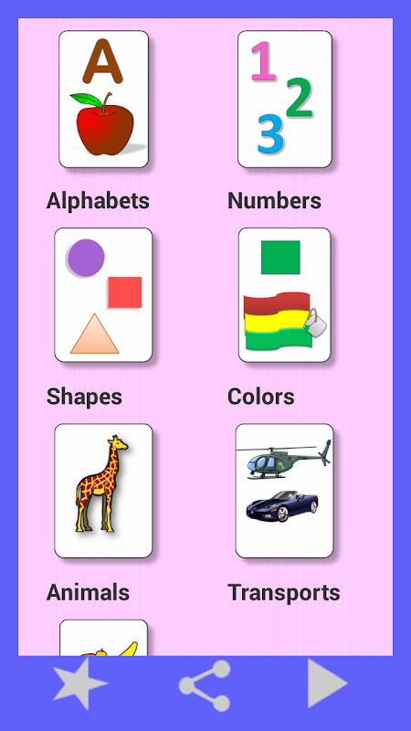 Aprendizagem do abc, formas, cores, números de animais e transporte com Flashcards
