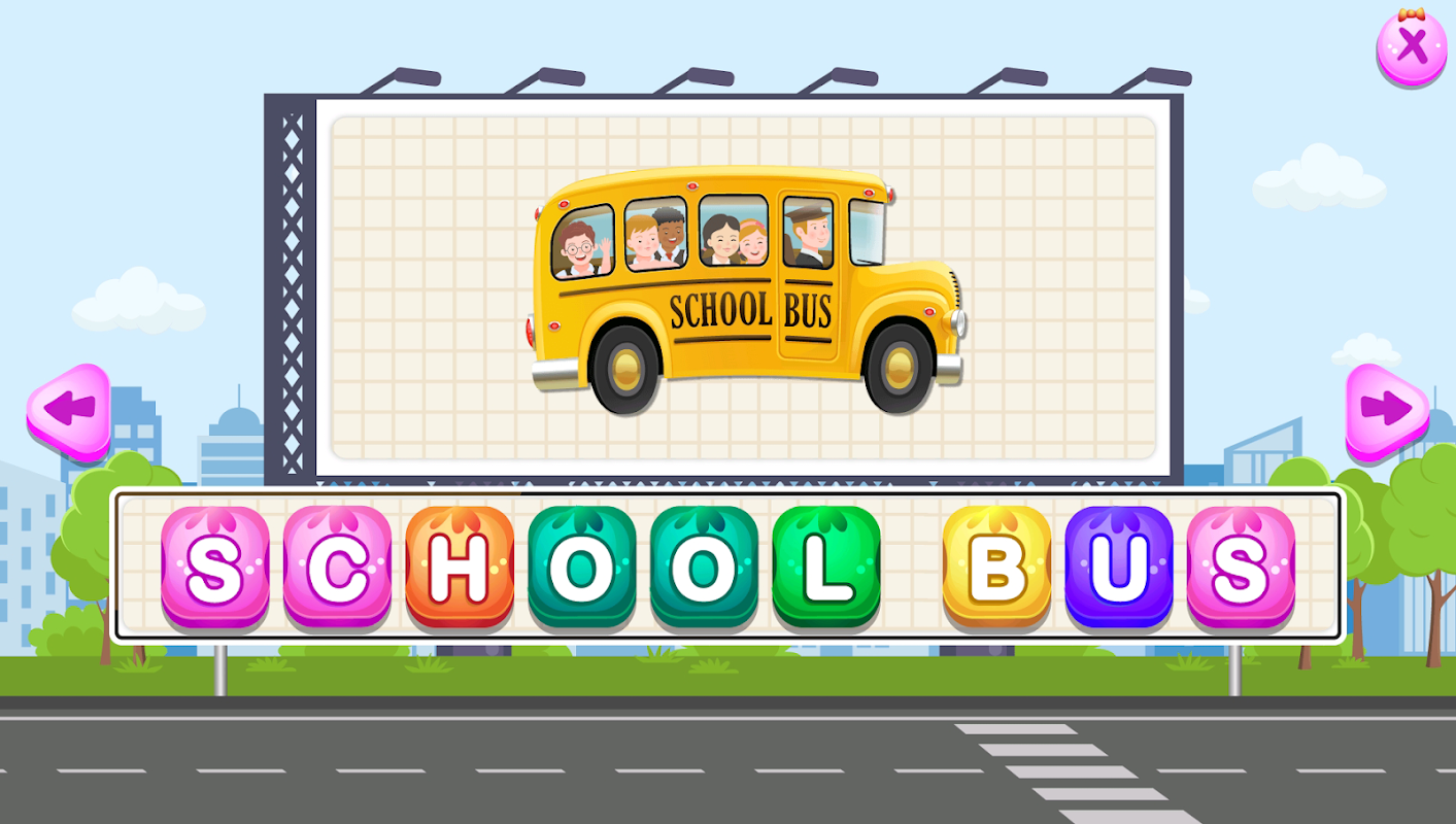 Existem duas seções neste aplicativo, uma é a seção de aprendizagem e a segunda é a seção de quiz. Na seção de aprendizagem As crianças podem aprender seguindo as palavras. Na seção de quiz, há duas partes, uma é fácil e a segunda é difícil, na seção fácil as crianças podem praticar facilmente preenchendo letras cinzas e na seção difícil para testar as crianças preenchendo as letras em caixas vazias.