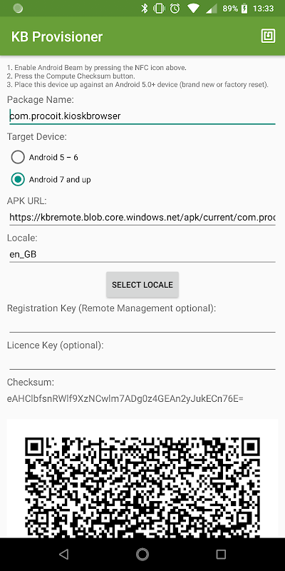 Configure the settings within the app and press generate QR code. From your brand new or factory reset device, tap the screen 6 times from the setup wizard welcome screen and follow the on-screen instructions to complete the provisioning process.
