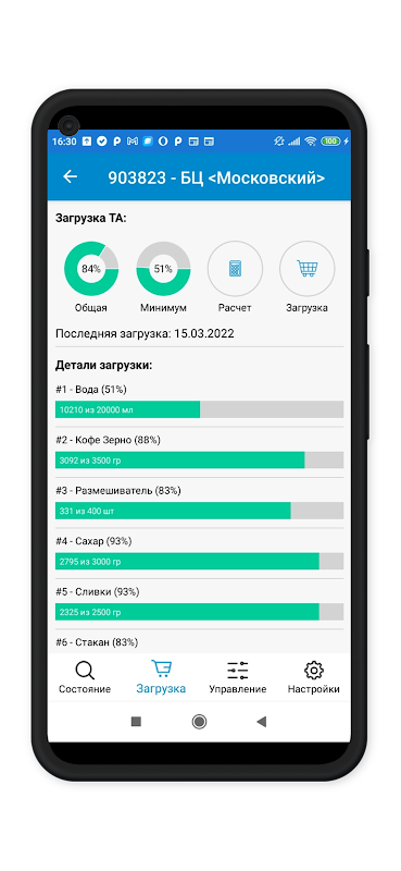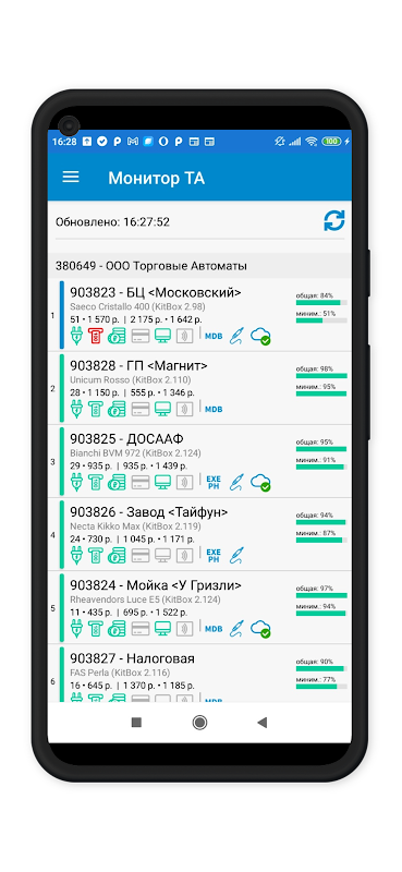 - controlo total sobre o funcionamento das máquinas de venda automática: o estado da máquina e do equipamento de venda automática, o montante e o montante em dinheiro para recolha e entrega;