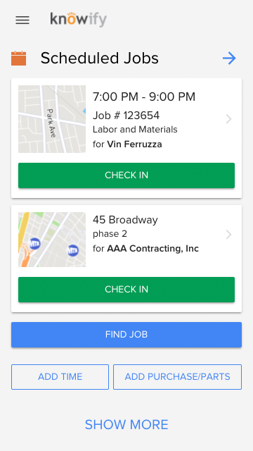 aplicativo móvel da Knowify automatiza o lado do campo do seu negócio de contratação, com clock de tempo simples, compras campo e ferramentas de reembolso, ordens de trabalho, compartilhamento de fotos e muito mais. Sincroniza com Knowify em tempo real. Requer assinatura Knowify.