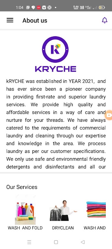 KRYCHE was established in the YEAR 2021 and has ever since been a pioneer company in providing first-rate and superior laundry services. We provide high-quality and affordable services in a way of care and nurture for your threads. We have always catered to the requirements of commercial laundry and cleaning through our expertise and knowledge in the area. We process laundry as per our customer specifications. We only use safe and environmentally friendly detergents and disinfectants and all our equipment are power conservative