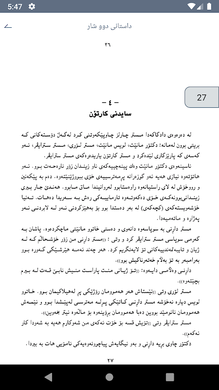دهتوانی پهرتووكهكان دابهزێنی له ئاپهكه و به شێوهی ستونی یان ئاسۆیی بیخوێنیهوه. دوای خوێندنهوهی چهند لاپهڕهیهك دهتوانی بۆ ههمان شوێن بگهڕێیهوه و خوێندنهوهكهت تكواا.