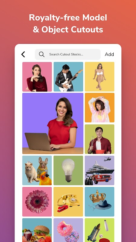 Crie anúncios de alta qualidade facilmente sozinho. Fornecemos megabibliotecas de modelos e recortes de objetos isentos de royalties prontos para usar para que seus anúncios pareçam profissionais. Não há mais contratação de modelo caro e filmagem em estúdio. Economize dinheiro e tempo.
