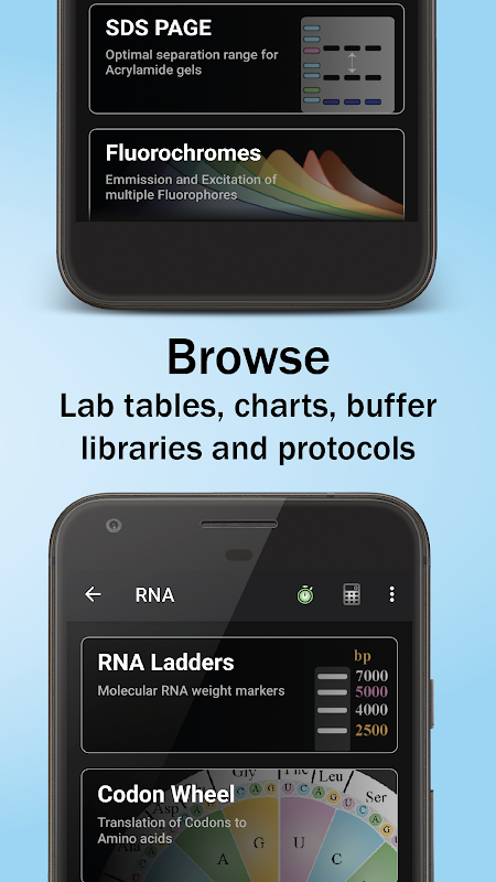 & # 8226; & # 8195; Descubra mais de 50 úteis tabelas, gráficos, gráficos e ilustrações sobre temas como o DNA, RNA e proteínas, que vão desde Peso Molecular Escadas de Gel%, frentes Corrida, Bases degenerados , Rodas Codon, detalhes de aminoácidos, SDS PAGE, Fluorocromos e propriedades de prato Cell