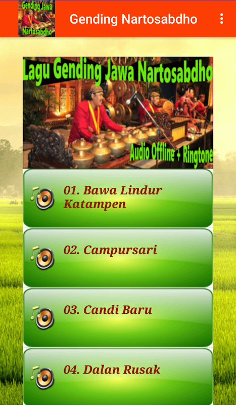 É apresentado o aplicativo Javanese Gending Song Nartosabdho, que contém as melhores obras do famoso marionetista musical Surakarta / Solo Ki Nartosabdho. Aproveite a bela combinação da música javanesa Gending com os doces sons de Sinden-Sinden da terra de Jawi. Aproveite o melhor Gending javanês de Ki Nartosabdho, como Gd Cucur Bawuk Kalj Ldr Srikaton Trus Ktw Pocung Kalj, Ayak2 Trus Slepeg Mawi Palaran Sl, Macapat Dhandhanggula Semarangan Sl.9 Barang Miring, Bawa Lindur Katampen Ladrang Lindur Sl.9, Gending Irim-irim Minggah Ladrang Envio de mercadorias, etc. Claro, este aplicativo é muito adequado para fãs da cultura javanesa, especialmente da arte musical.