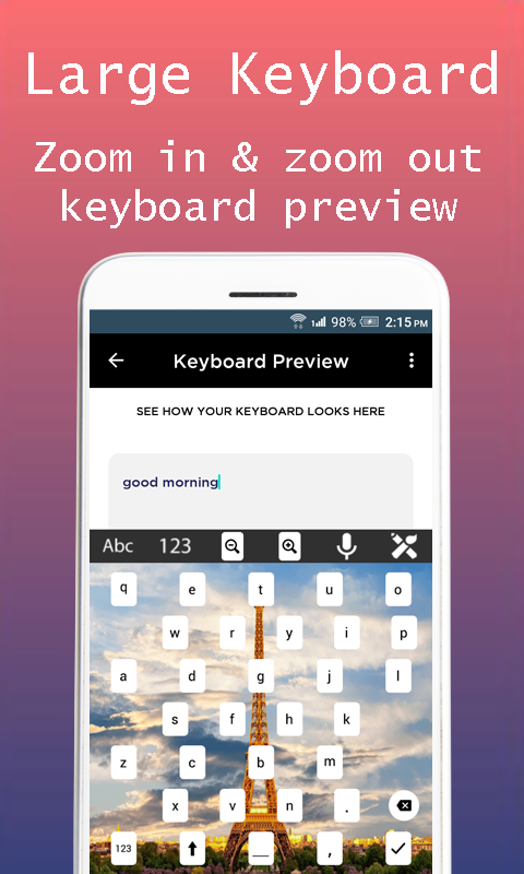O aplicativo de teclado com botões grandes reduzirá o cansaço visual e preservará sua visão. Você sente dificuldade em digitar com o minúsculo teclado antigo, então o melhor teclado grande para Android lhe dará facilidade para digitar texto rapidamente. Este grande aplicativo de teclado offline também é muito útil para os idosos e para aqueles que têm problemas de visão.
