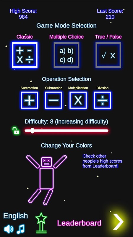 Laser Math é um jogo matemático com tema de laser e neon. Ele é projetado para praticar soma, subtração, multiplicação e divisão.