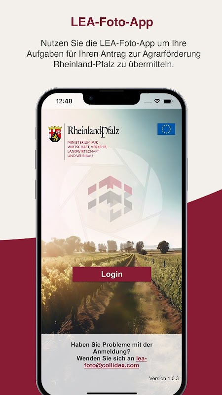 Está a apresentar um pedido de financiamento agrícola relacionado com a área na Renânia-Palatinado? Em seguida, use o aplicativo de fotos LEA para poder reagir direta e facilmente a questões pouco claras no pedido de financiamento agrícola. Tal como acontece com a LEA, o registo é feito através do número da empresa e do PIN. Correspondendo à plataforma de financiamento da LEA, existe uma aplicação móvel para smartphone ou tablet para gestão da área. O aplicativo de fotos com o nome LEA photo app está disponível para todos os agricultores do Ministério da Economia e Transportes. Agricultura e viticultura fornecidas gratuitamente.