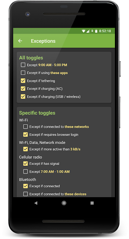 As conexões são restauradas automaticamente quando a tela é ligada novamente ou desbloqueada. Você também pode optar por restaurar as conexões periodicamente enquanto a tela estiver desligada para permitir notificações push e sincronização em segundo plano. Apenas as conexões que foram desativadas automaticamente pelo LeanDroid são reativadas. As conexões que foram desativadas manualmente permanecem intactas.
