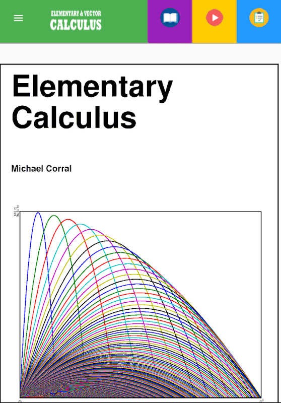 This app contains two classics, Elementary Calculus and Vector Calculus both written by Prof Michael Corral, Professor, Mathematics Department, Schoolcraft College , Livonia, Michigan, USA.