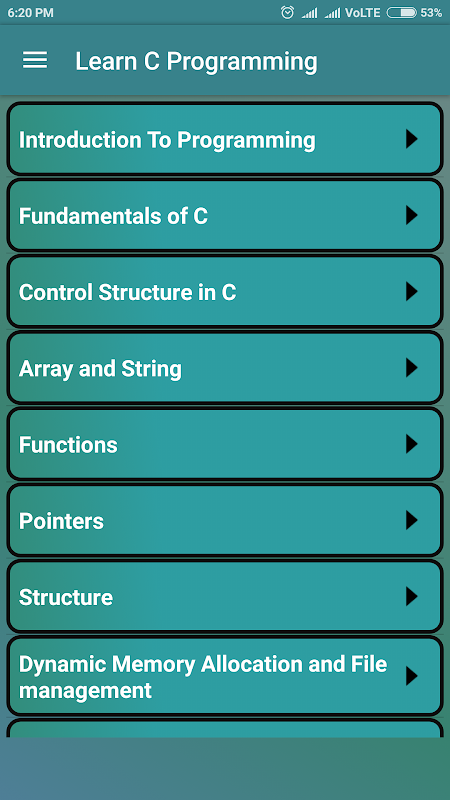 Domine a programação C com Aprenda Programação C! Este aplicativo gratuito é o seu recurso completo para aprender C, desde os fundamentos até conceitos avançados. Quer você seja um iniciante ou queira aprimorar suas habilidades, nossa interface amigável e explicações claras irão guiá-lo durante o processo.