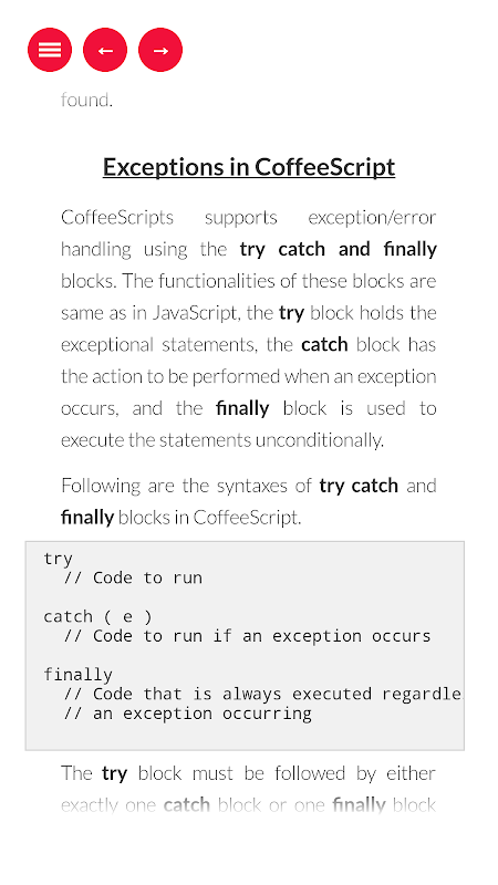Este aplicativo inclui todos os conceitos básicos do CoffeeScript para iniciantes, bem como conceitos avançados e intermediários para especialistas.