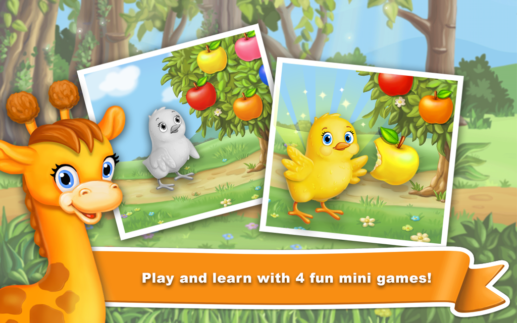 4. No último jogo seu toddler verá uma árvore de maçã com maçãs de cores diferentes. Um dos animais aprendidos antes chega até a macieira. O miúdo deve alimentar o animal com uma maçã da mesma cor que o animal é.
