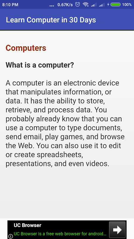 This app is useful for those who are starting to learn computer basics like what is Software, What is hardware etc.