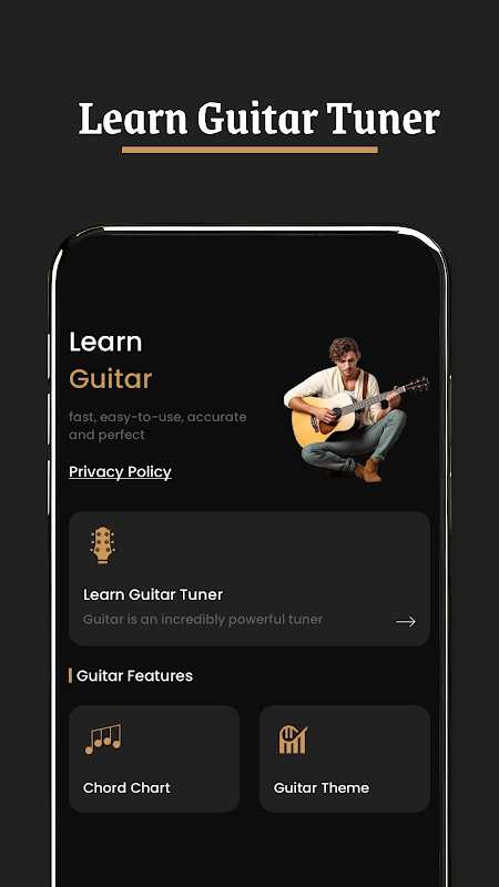 Tuner, Chords, Tabs é um recurso inteligente, prático e de alto desempenho, como afinador de instrumentos e acordes. Guitar Tuner é um afinador rápido, fácil de usar, preciso e perfeito para iniciantes e especialistas. Toque guitarra com acordes, tablaturas e letras. Nenhum toque ou ajuste é necessário. Abra o afinador de guitarra e comece a afinar a guitarra. A maneira mais fácil de afinar sua guitarra com um aplicativo de afinador de guitarra simples, preciso e com viva-voz. Guitar Tuner oferece aos seus usuários um afinador definitivo que funciona bem com uma variedade de instrumentos de cordas.