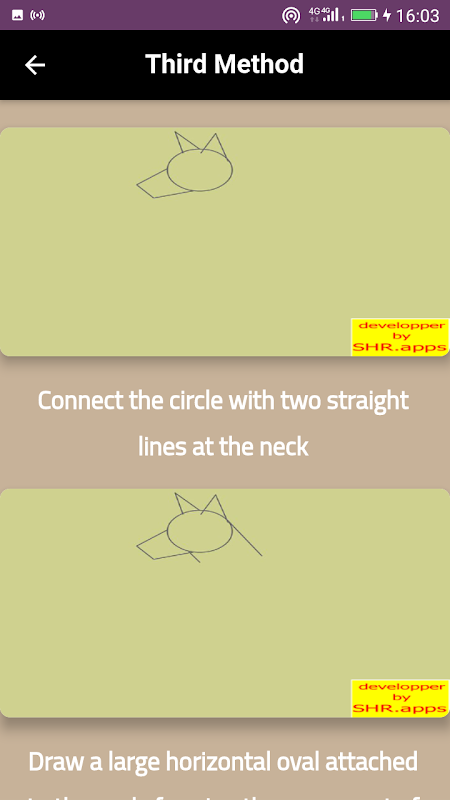 This application contains a lot of method and ways how to draw a dog realistic and color it easy step by step with pictures, you will learn how to draw a complete dog and dog face, paw print, bone, art hub, bowl, bed, caricature, cat, with the word dog and share your art with a story.