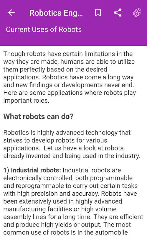Você pode aprender facilmente engenharia robótica usando este aplicativo. A Engenharia robótica básica é muito fácil de aprender se você estiver interessado em Engenharia robótica. Este aplicativo tem notas básicas de engenharia de robótica e tutorial.