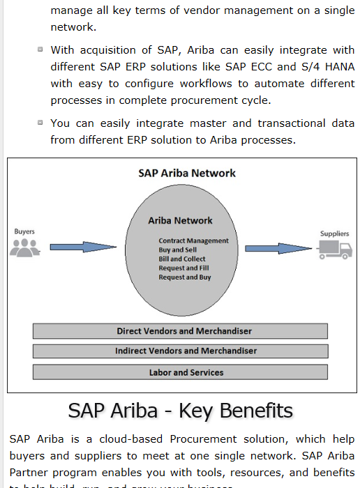 SAP Ariba, Tutorial, Introduction, Key Benefits, Account Configuration, User and Role Management, Supplier Membership Fees, Configuring SAP ERP, Configuring Ariba Procurement Solution, Buyers and Supplier Terms, Integrating Master Data, Integrating Transaction data, SAP ERP Transports, Downloading workbooks, Installation, Configuration, Security Details, Logging and Auditing, Comparison With Other Tools, Solution areas, Configurable workflows, Reporting options, Integration with S/4 HANA, Best Practices for integration.