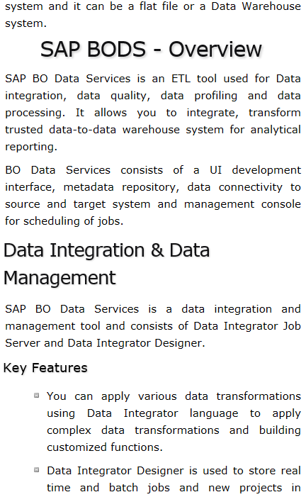 SAP BODS Quick Guide - Learn SAP BODS in simple and easy steps starting from basic to advanced concepts with examples including DW Overview, Types, Products and Vendor, ETL Introduction, SAP BODS Overview, Architecture, Data Services Designer, Repository Overview, Creating and Updating, Data Services Management Console, DSMC Modules, DS Designer Introduction, ETL Flow in DS Designer, Datastore Overview, Changing a Datastore, Memory Datastore, Linked Datastore, Adapter Datastore, File Formats, COBOL Copybook File Format, Extracting Data from Database Tables, Data Extraction from Excel Workbook, Dataflow Introduction, Changing Properties, Workflow Introduction, Creating Workflows, Transforms Types, Adding Transform to a Dataflow, Query Transform, Data Services Overview, Creating Embedded Dataflow, Debugging and Recovery Mechanism, Data Assessment and Profiling, Tuning Techniques, Central vs Local Repository, Security, Creating a Multiuser Environment.