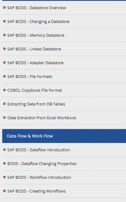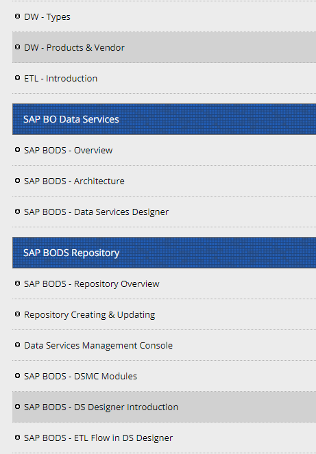 SAP BODS, Tutorial, DW Overview, Types, Products and Vendor, ETL Introduction, SAP BODS Overview, Architecture, Data Services Designer, Repository Overview, Creating and Updating, Data Services Management Console, DSMC Modules, DS Designer Introduction, ETL Flow in DS Designer, Datastore Overview, Changing a Datastore, Memory Datastore, Linked Datastore, Adapter Datastore, File Formats, COBOL Copybook File Format, Extracting Data from Database Tables, Data Extraction from Excel Workbook, Dataflow Introduction, Changing Properties, Workflow Introduction, Creating Workflows, Transforms Types, Adding Transform to a Dataflow, Query Transform, Data Services Overview, Creating Embedded Dataflow, Debugging and Recovery Mechanism, Data Assessment and Profiling, Tuning Techniques, Central vs Local Repository, Security, Creating a Multiuser Environment.