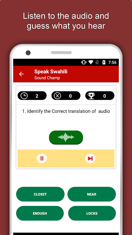 O aplicativo Offline Learning Swahili tem 2.135 palavras com 55 categorias. Ele contém pronúncia, imagens e fonética das palavras para a aprendizagem fácil. Mudar idioma base, salvar aprendizados em EduBank℠, a reprodução de áudio, Potpourri e jogos de retenção são as principais características do Fale Swahili aplicativo.