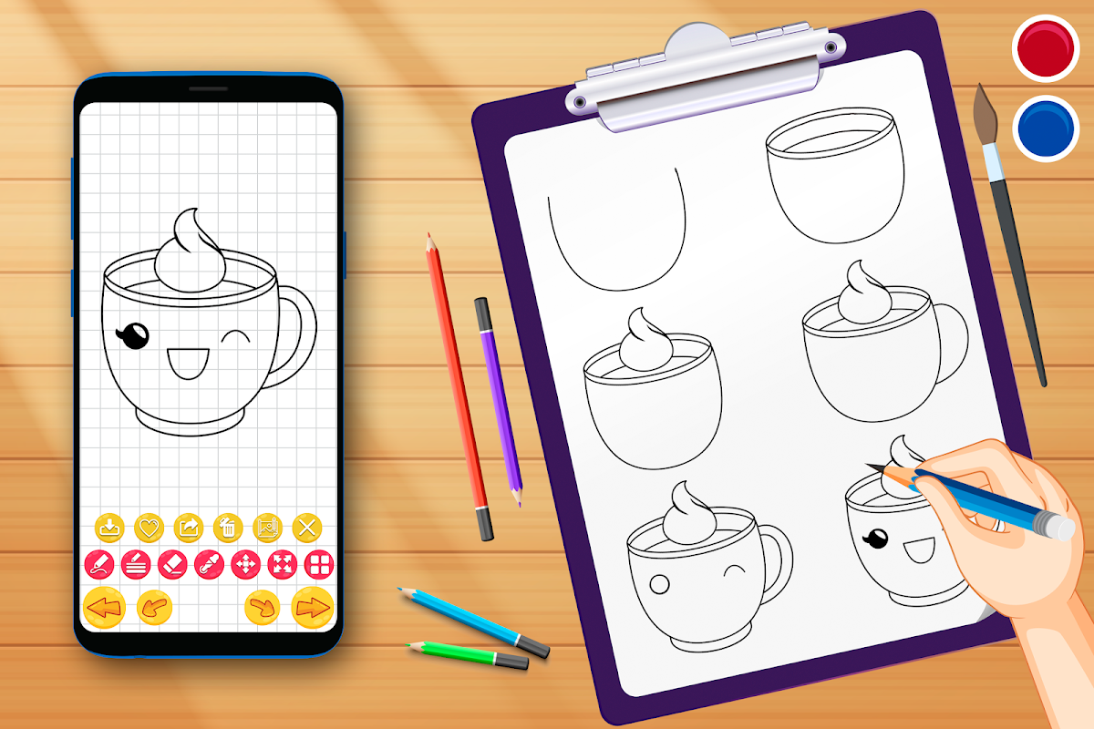 Sem nenhuma habilidade especial e hesitação, comece a desenhar e seja criativo usando o aplicativo Draw Food & Drinks - Aprenda a desenhar o aplicativo Cute Food.