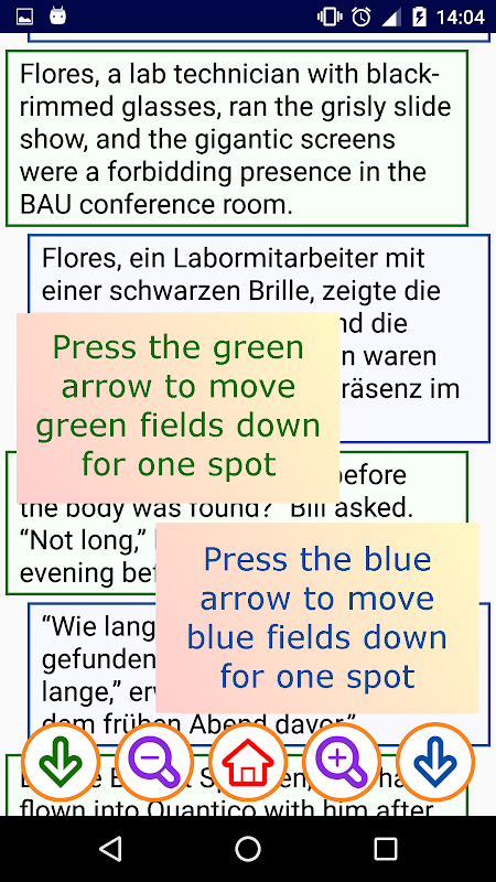 Expand your vocabulary, while reading in your home language and the language you want to learn. For easier reading on the mobile screen few sentences in your language are followed with a few sentences in another language and so on. If the sentences get unaligned, you can realign them with the blue and green down arrows at the bottom, that move all blue/green fields one step down.You can click on any word to translate it in any language with your online dictionary.