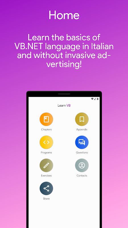 A aplicação tem uma interface muito simples e pode ser usada por todos. O aprendizado do VB.NET está offline e pode ser usado a qualquer hora e local. É especialmente recomendado para quem deseja aprender o VB.NET, mas também para quem deseja aprofundá-lo ou revisá-lo.