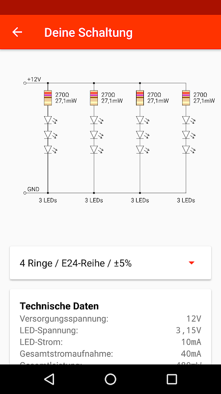 - Individuellle Darstellung des Schaltplans der gesamten LED-Schaltung mit entsprechendem Widerstand (wahlweise als Empfehlung mit 4 oder 5 Ringen oder auch als berechneten Wert)