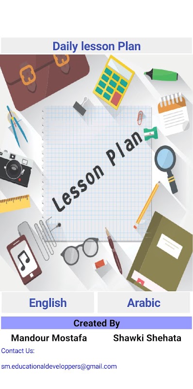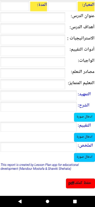 Este aplicativo fornece um plano de aula diário digital para professores em ambos os idiomas árabe e inglês, os professores podem inserir imagens e podem escrever o texto do plano de aula sem problemas. Finalmente, o arquivo pode ser salvo como extensão pdf.
