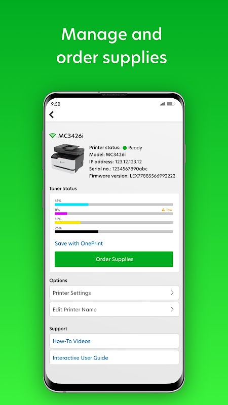 Simplifique a configuração da impressora, gerencie e encomende suprimentos ou inscreva-se para uma assinatura do Lexmark OnePrint™ em qualquer lugar.