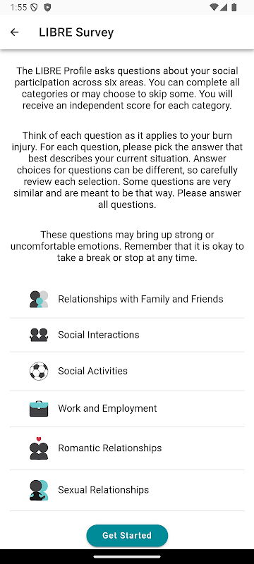 O Perfil LIBRE é um instrumento de pesquisa desenvolvido para medir a participação social de pessoas com queimaduras, desenvolvido pelo Spaulding Rehabilitation Hospital, Massachusetts General Hospital, Boston University e Phoenix Society for Burn Survivors. O desenvolvimento deste aplicativo foi parcialmente apoiado pela App Factory para apoiar a saúde e a função de pessoas com deficiência, financiada por uma doação do Instituto Nacional de Pesquisa sobre Deficiência, Vida Independente e Reabilitação (NIDILRR) do Departamento de Saúde e Serviços Humanos dos EUA para o Centro Shepherd (Concessão # 90DPHF0004).