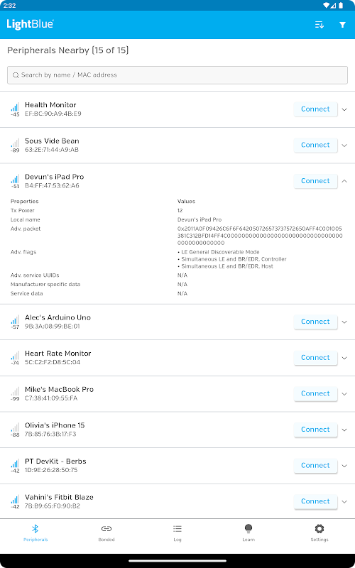 - Veja as informações básicas do dispositivo (nome, endereço MAC, RSSI) de relance