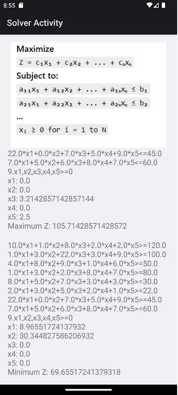 O aplicativo usa para otimização a classe SimplexSolver da biblioteca padrão org.apache.commons:commons-math:3.6.1.