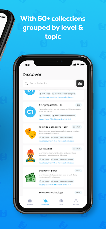 * Mantenha-se envolvido e motivado: aprenda usando baralhos de livros, filmes e muito mais para obter uma recompensa direta por aprender novas palavras.