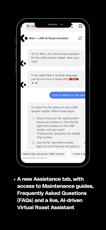 O Link App é o aplicativo móvel que acompanha o Link Sample Roaster da Nucleus Coffee Tools e Kaffelogic. Utilizando este aplicativo, os usuários do Link podem inserir uma série de informações sobre o café que desejam torrar, e a seleção de perfil algorítmico do aplicativo fornecerá a recomendação mais ideal para pacote de perfil de torra, curva de potência/perfil de torra, faixa de desenvolvimento sugerida, ação do ventilador ( velocidade do ventilador) e o primeiro crack esperado para cada café.
