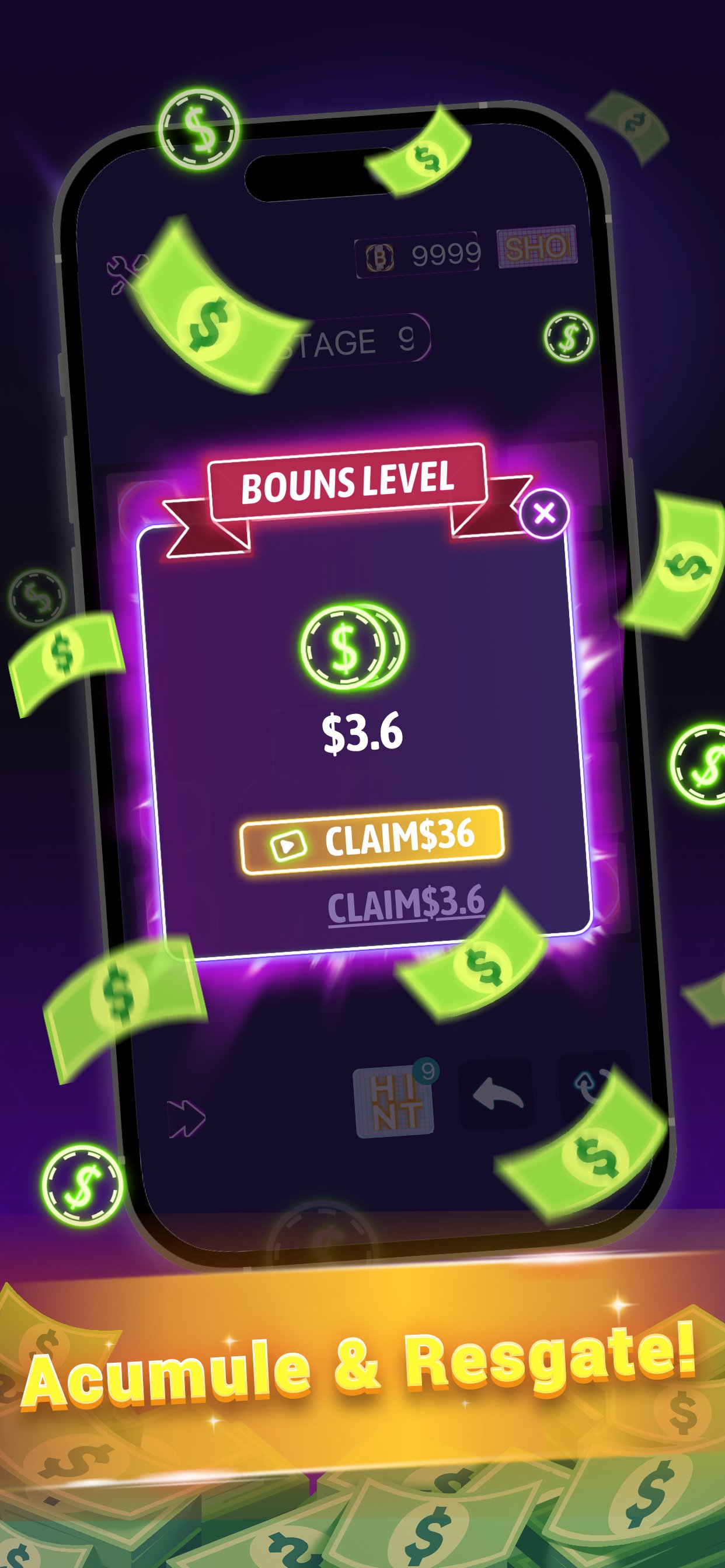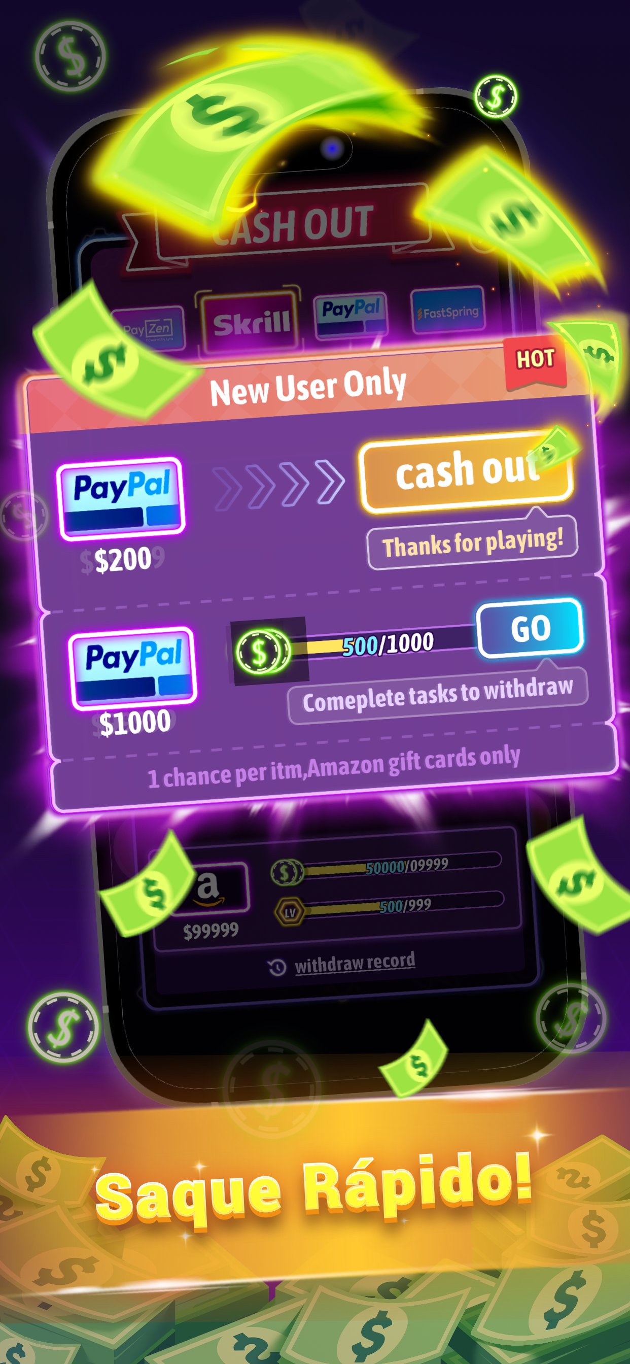 Complete as fases, resgate suas recompensas em dinheiro ou cartões-presente. É diversão com um extra!