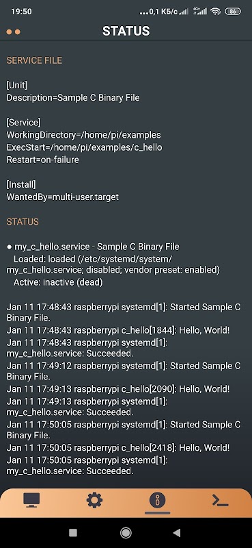 Working with the application is simple. It is necessary that the smartphone and the microcomputer are connected to the same Wi-Fi router (I use the smartphone itself as a Wi-Fi access point). The microcomputer must have an SSH server (there is a lot of information on the Internet on how to install it). Then you go into the application, enter the IP: Port login-password of the microcomputer. And you get the ability to quickly manage system daemons and add your own scripts to work with devices.
