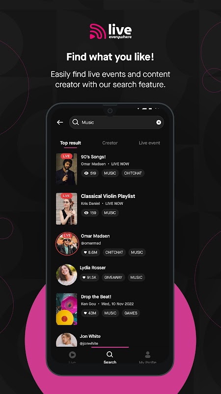 • Com um novo visual que pode rolar instantaneamente para baixo, ficou ainda mais fácil encontrar seus shows e artistas ao vivo favoritos! Você pode pesquisar eventos ao vivo e os próximos shows a qualquer momento, enquanto espera seu artista favorito ir ao vivo, você também pode assistir outras transmissões ao vivo.