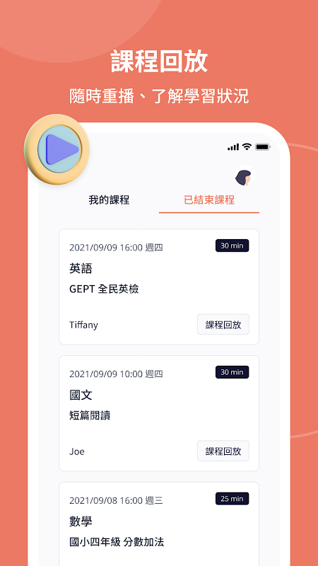 Quando você está ocupado, mesmo que perca o horário da aula, você pode usar a função de reprodução da aula para reproduzir o status de aprendizagem da aula online de seu filho, e não há diferença de tempo entre o status de aprendizagem das crianças participantes.