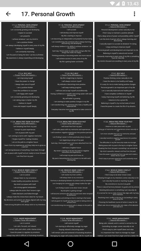 Features: quick and easy navigation, user friendly interface, affirmation categories, present tense affirmations, future tense affirmations, natural affirmations.